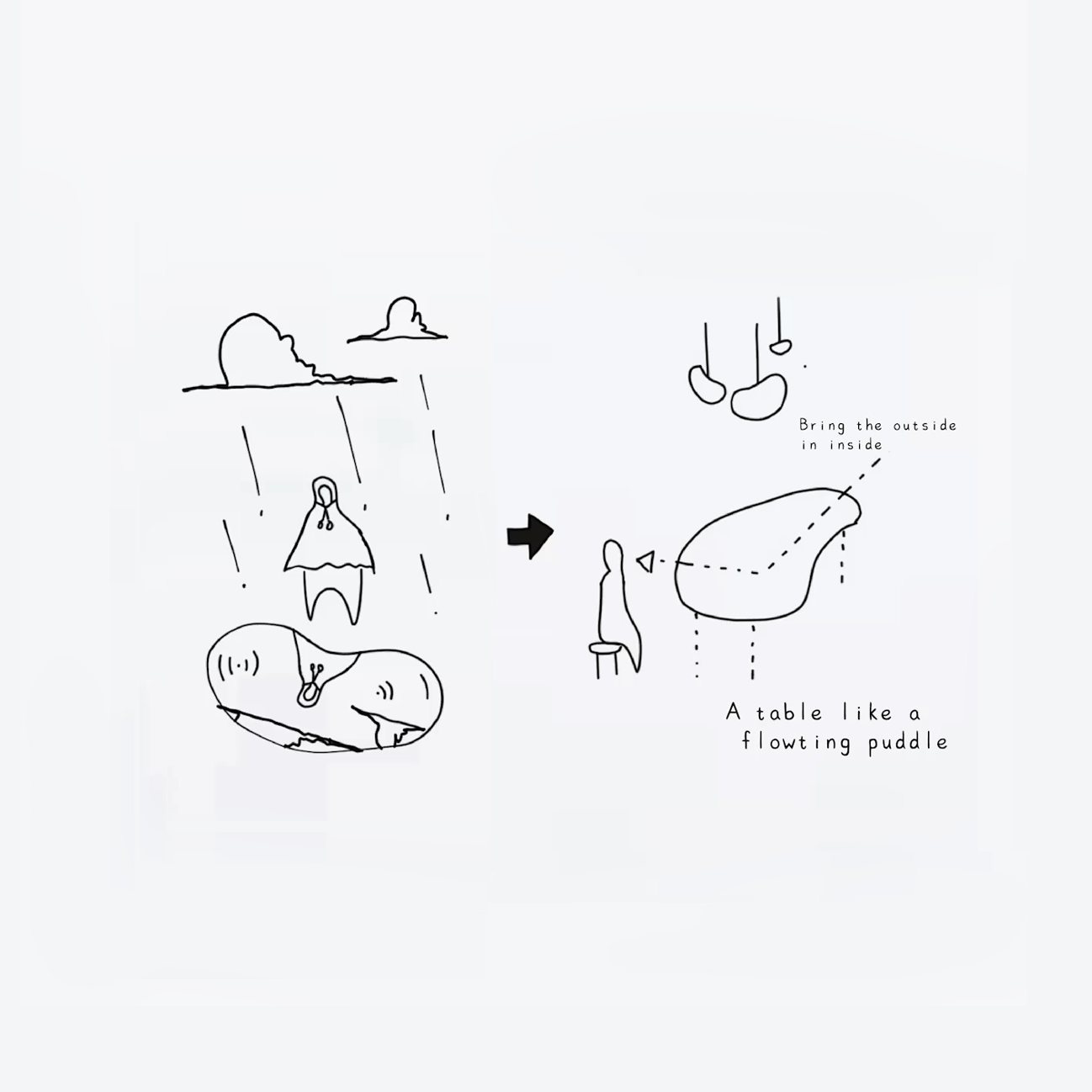 鏡面の天板は、時間帯や天気、人の動きに合わせて表情を変え、まるで水たまりのように景色を映し替えます。